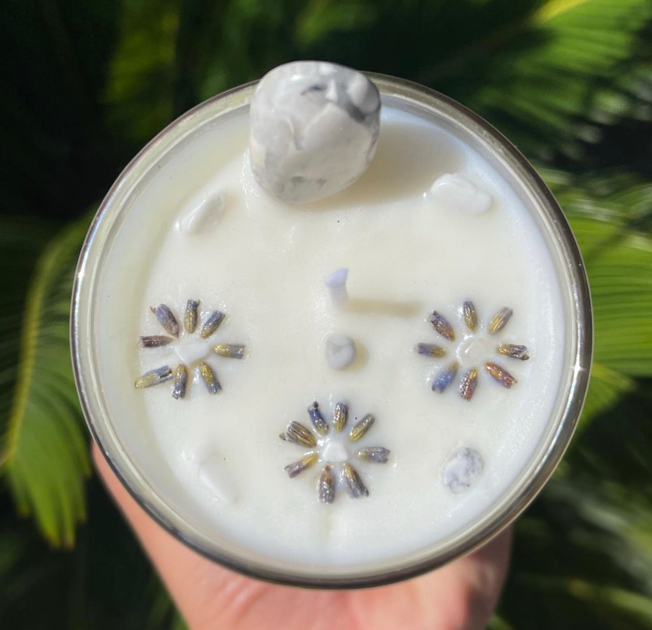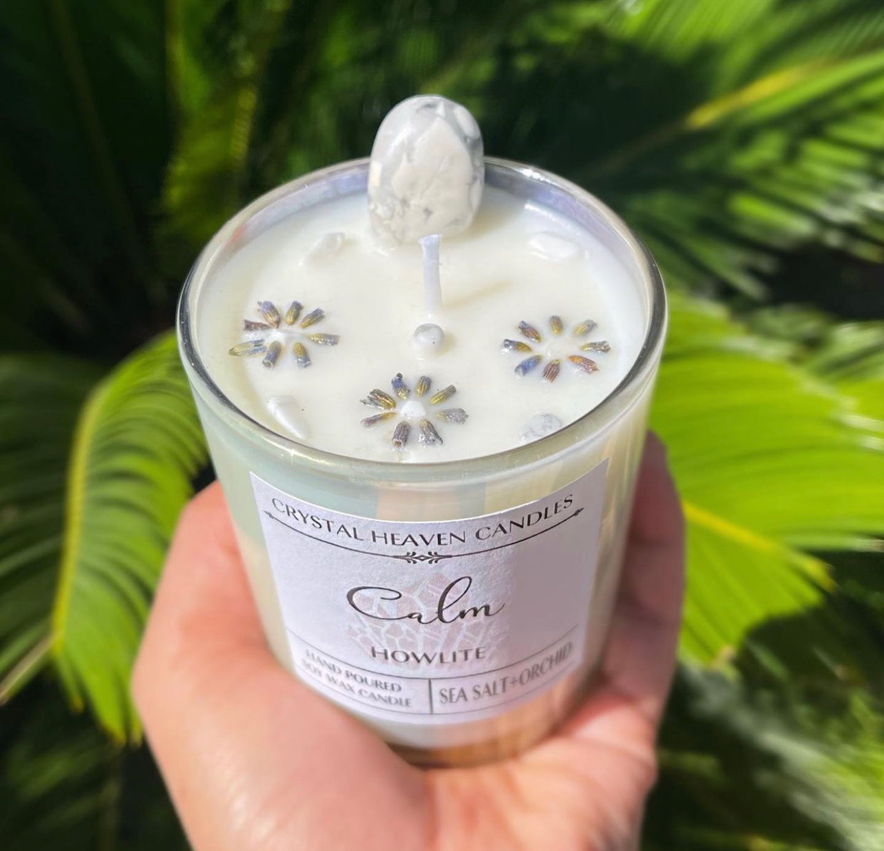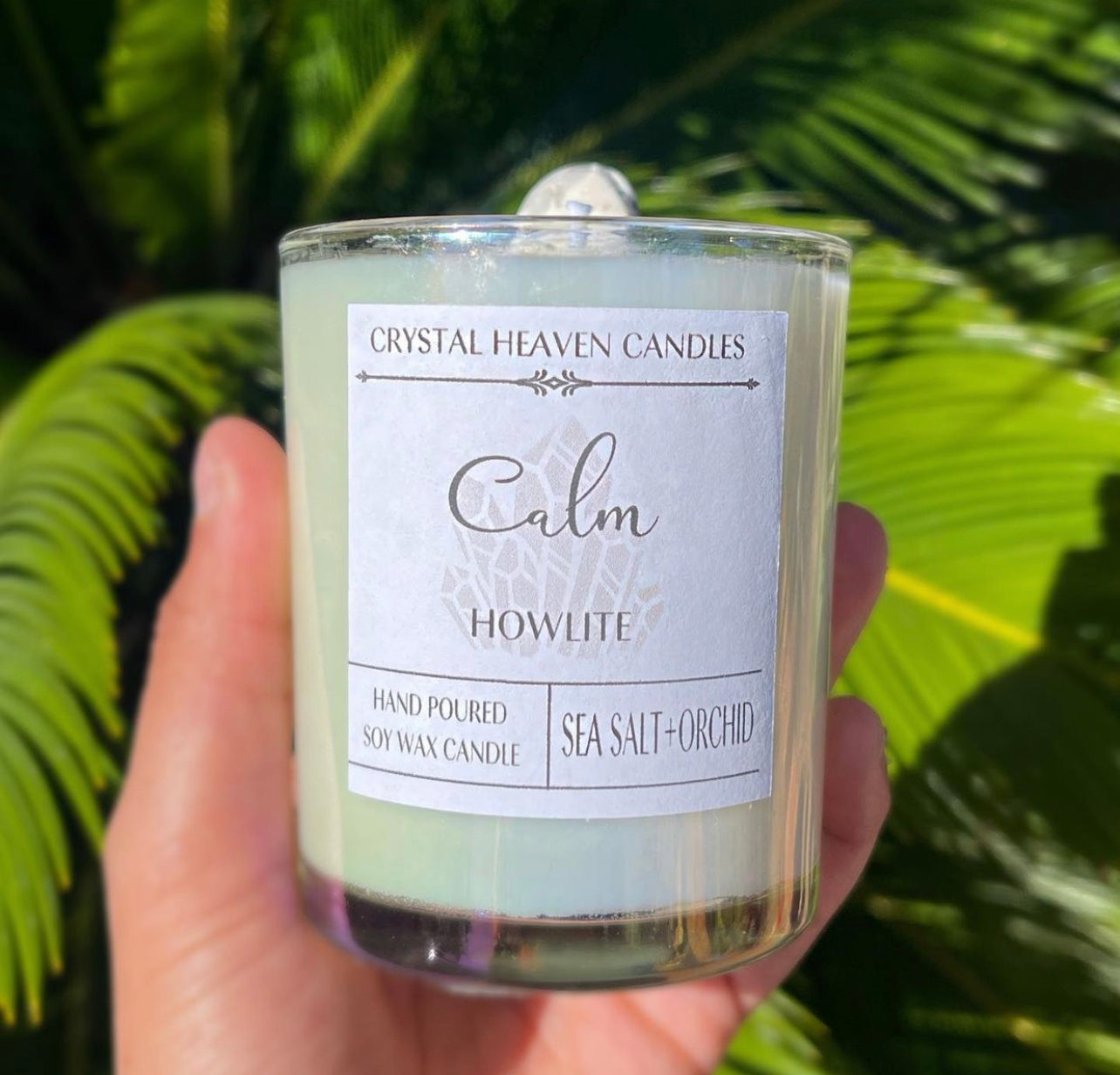 This candle is infused with a Howlite tumbled and Howlite crystal chips scented Seat Salt + Orchid. Howlite is an extremely calming and soothing crystal. Teaches patience and helps to eliminate rage, pain and stress.