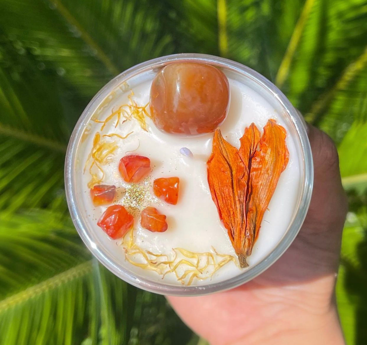 This candle is infused with a Carnelian tumbled and Carnelian crystal chips topped with lily flowers scented raspberry, coconut, and peach. Carnelian is a stabilising crystal and is great for confidence, vitality and motivation. It gives one courage and promotes positive life choices whilst motivating you towards success. It sharpens concentration and protects against envy, rage and resentment. Carnelian banishes emotional negativity and replaces it with a love of life.