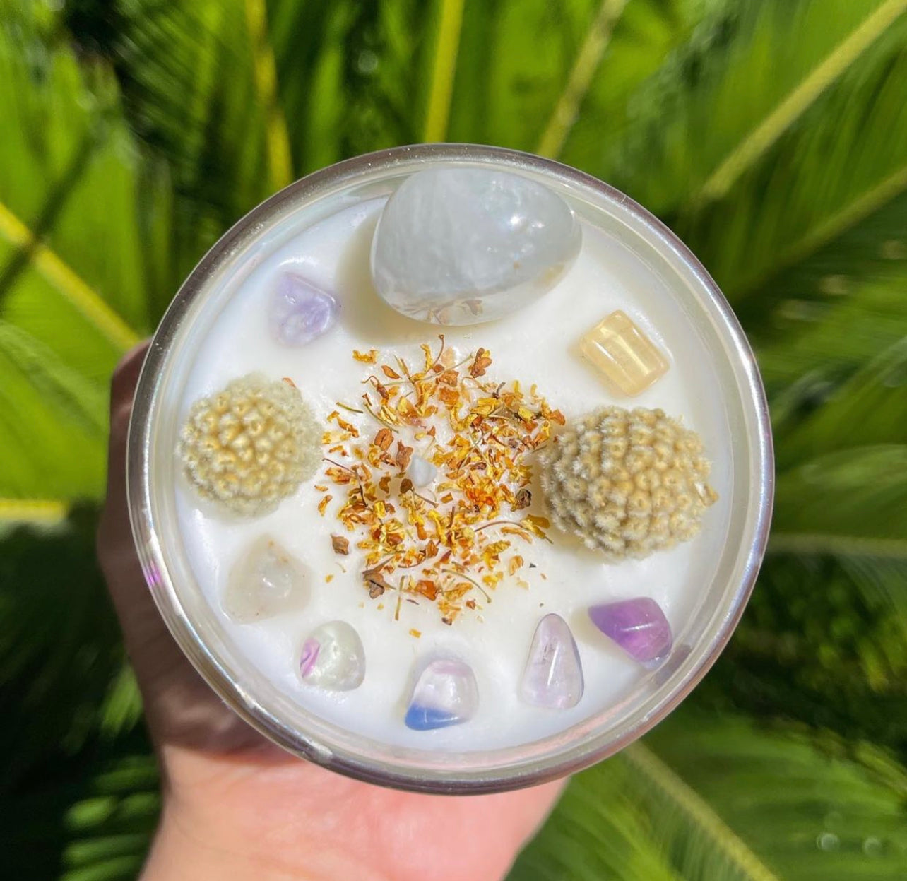 This candle is infused with Rainbow Fluorite tumbled and Rainbow Fluorite crystal chips scented Lemon + Grapefruit. Rainbow Fluorite is also known as the “genius stone,” as it efficiently allow us to maintain an open mind while activating motivation and focus.