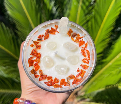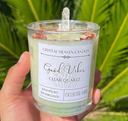This crystal candle is infused with a Clear Quartz point and Clear Quartz crystal chips scented Coca Butter + Amber. Clear Quartz is considered a "Master Healer." Clear Quartz amplifies energy by absorbing storing, releasing, and regulating.