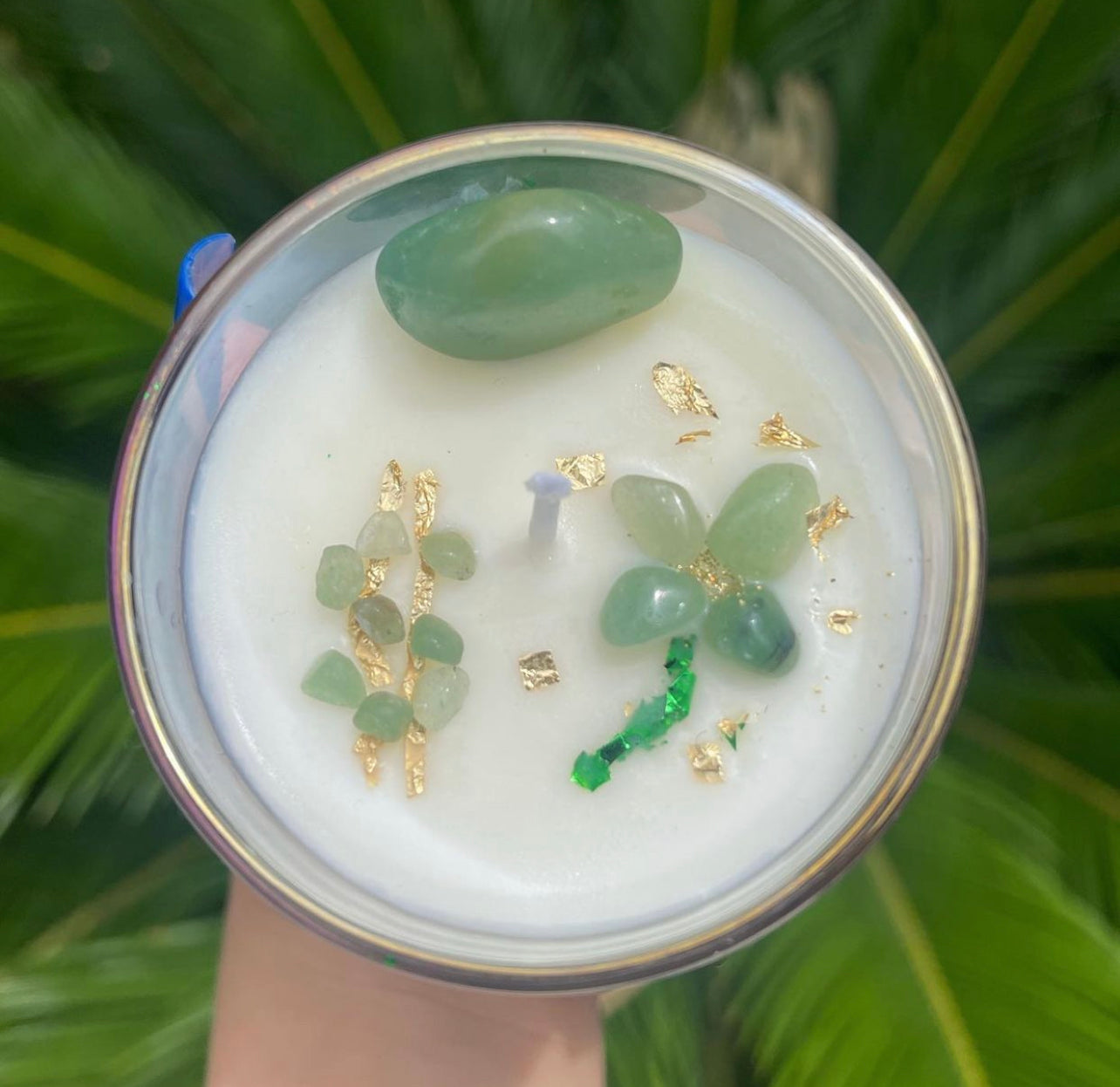 This candle is with a Green Aventurine tumbled and Green Aventurine Crystal chips scented mango + coconut. Green Aventurine helps you be mindful about what’s helping you be more successful and what’s just getting in the way. As the “crystal of opportunity”, green aventurine will help you to see an abundance of opportunities all around you. More so, this crystal will inspire the courage you need to go after those opportunities, whether that means applying for that job, starting that business, asking that person out, asking for that raise, or any other act of bravery!