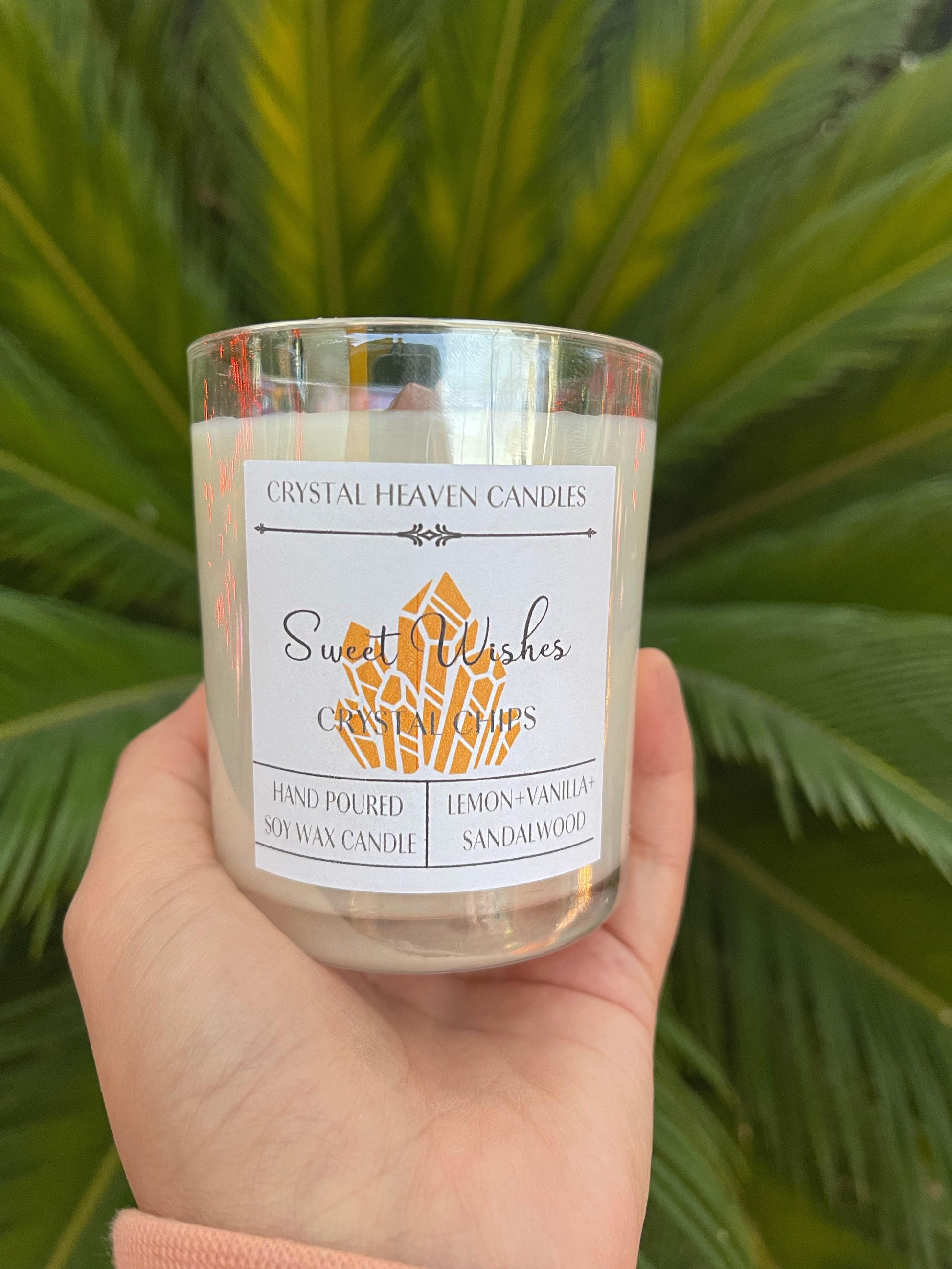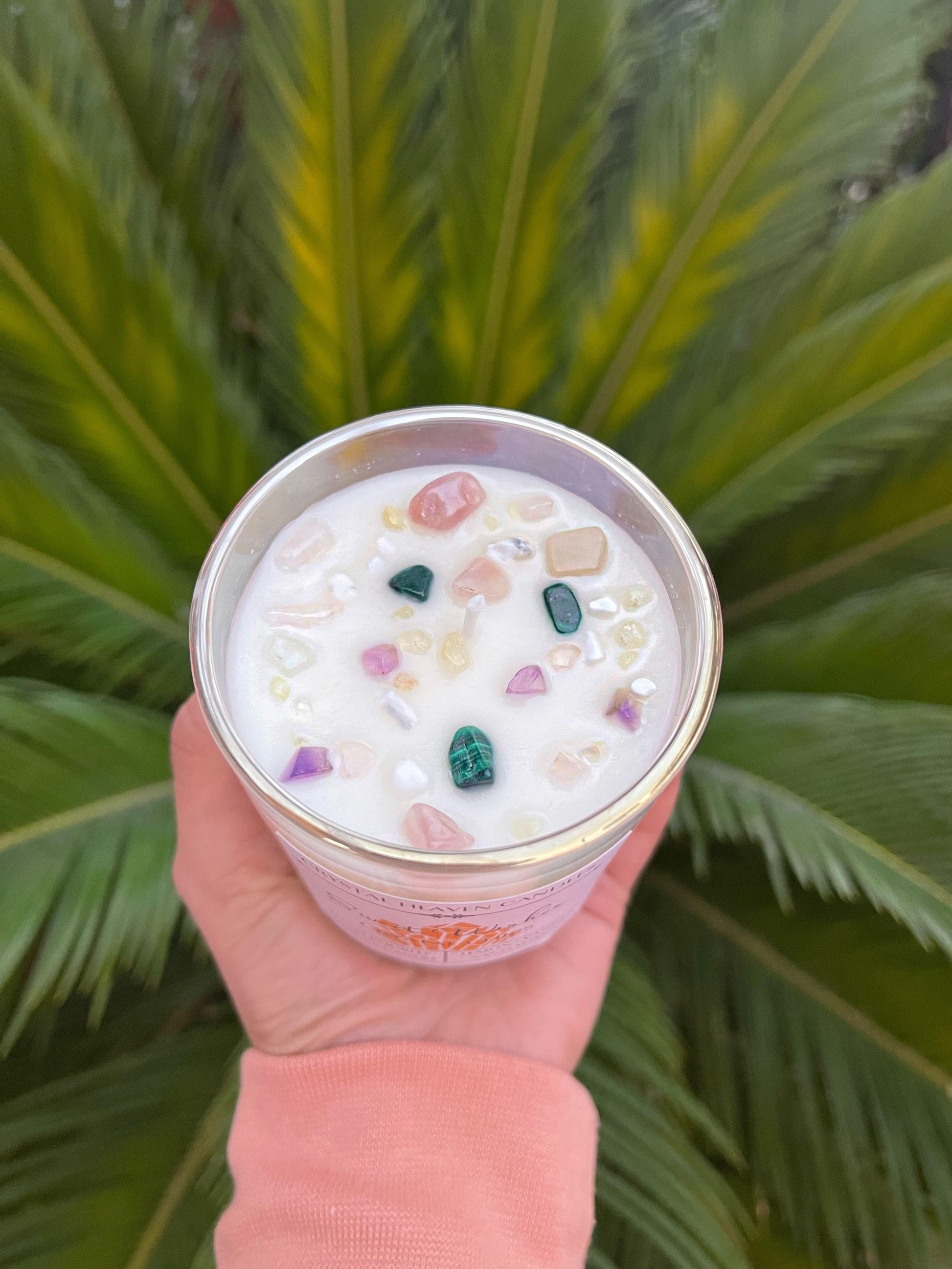 This candle is infused with different crystal chips: Amethyst, Rose Quartz, Clear Quartz, Howlite, Rainbow Fluorite, and Malachite scented Lemon + Vanilla + Sandalwood.